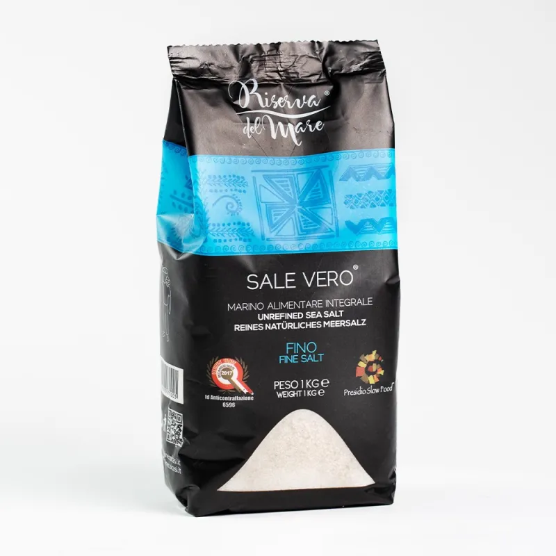 Riserva del Mare whole salt has a unique and intense taste, is easily absorbed by the body, promotes alkaline pH and detoxifies. Thanks to its salting power, the amount needed is considerably lower than other industrial salts, greatly limiting the onset of certain diseases such as: hypertension, arterial plaques, concentration problems, memory loss and acidosis.